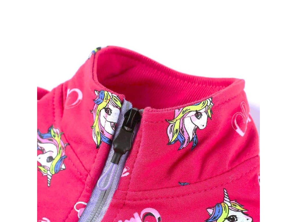Tato jarní mikina je zdobena kouzelným motivem jednorožců, což ji činí ideální volbou pro malé holčičky, které milují pohádkové postavy. Díky praktickému propínání na zip je oblékání a svlékání snadné a rychlé, což ocení nejen děti, ale i rodiče. Mikina má prodloužená záda zakončená do mírného šosu, což jí dodává moderní vzhled a zajišťuje pohodlí při nošení. Příjemný materiál 95% bavlna a 5% elastanu zajistí komfort po celý den ve školce i na hřišti. Rukávy a spodní lem jsou zakončeny stylovou lemovkou, která přidává mikině na eleganci a zajišťuje, že dobře sedí.