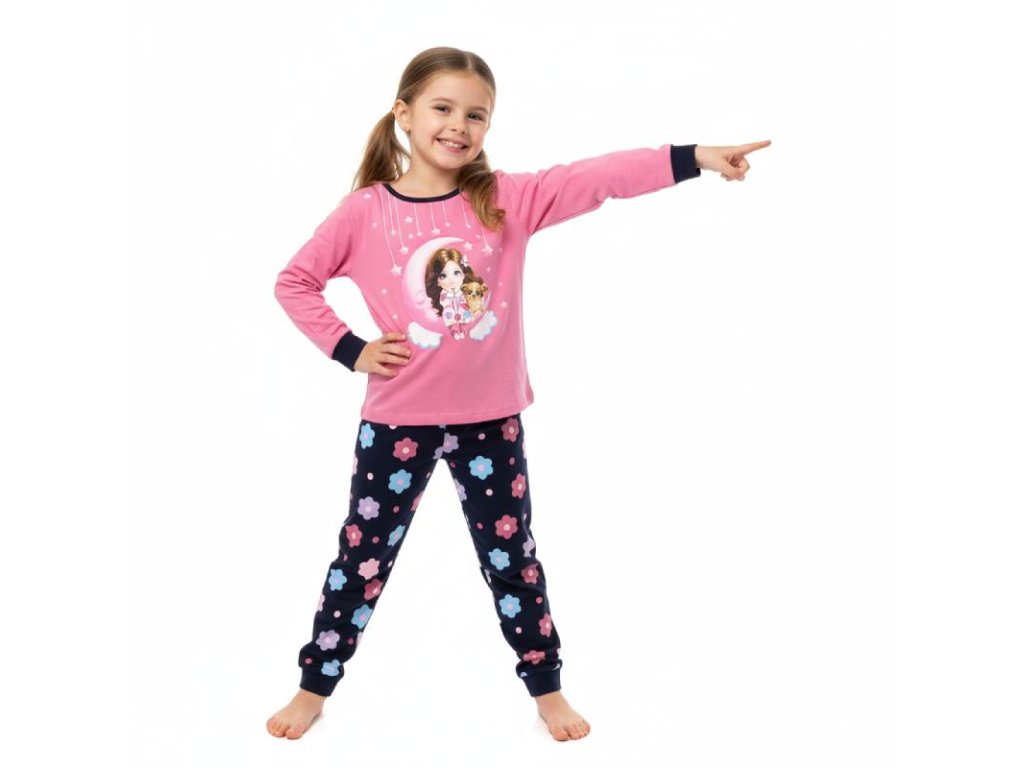 Roztomilé dívčí pyžamo s pejskem a holčičkou potěší všechny malé slečny, které chtějí mít pohodlný a zároveň hezký noční outfit. Pyžamo je vyrobené z kvalitní 100% bavlny, takže je měkké, prodyšné a příjemné na tělo.