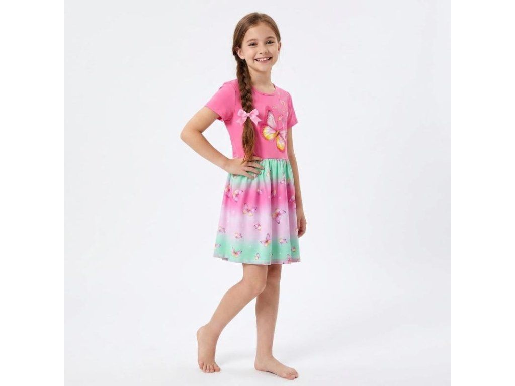 Dívčí letní šaty v krásných duhových barvách. Tyto dívčí šaty s krátkým rukávem jsou nejen roztomilé, ale také pohodlné. Díky elastické gumičce v pase nabízejí perfektní přizpůsobení a maximální pohodlí. Vaše dcera se bude cítit jako princezna, když bude nosit tyto šaty, které jsou plné svěžího stylu a radosti z dětství.