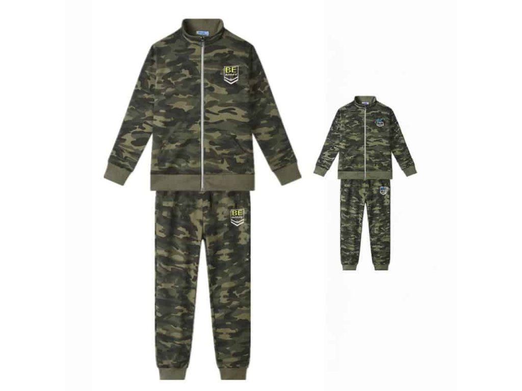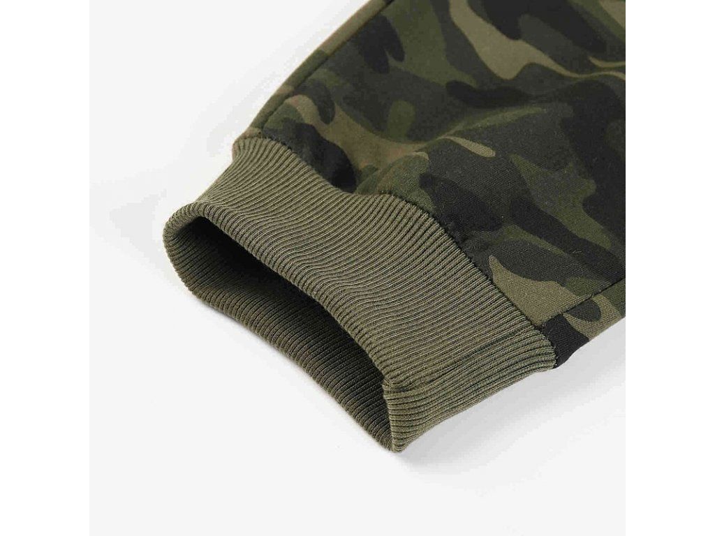Dětská, chlapecká mikina a tepláky v maskáčovém designu je rozepínací na zip. Mikina je se stojáčkem, rukávy a v pase je mikina zakončena do nápletu. Součástí jsou tepláky s kapsami, které jsou v pase do pohodlné gumy. Nohavice jsou zakončeny nápletem. Tepláková souprava pro kluky je ideální na tábory, výlety ale i pro běžné nošení. Pohodlná pro každý den.