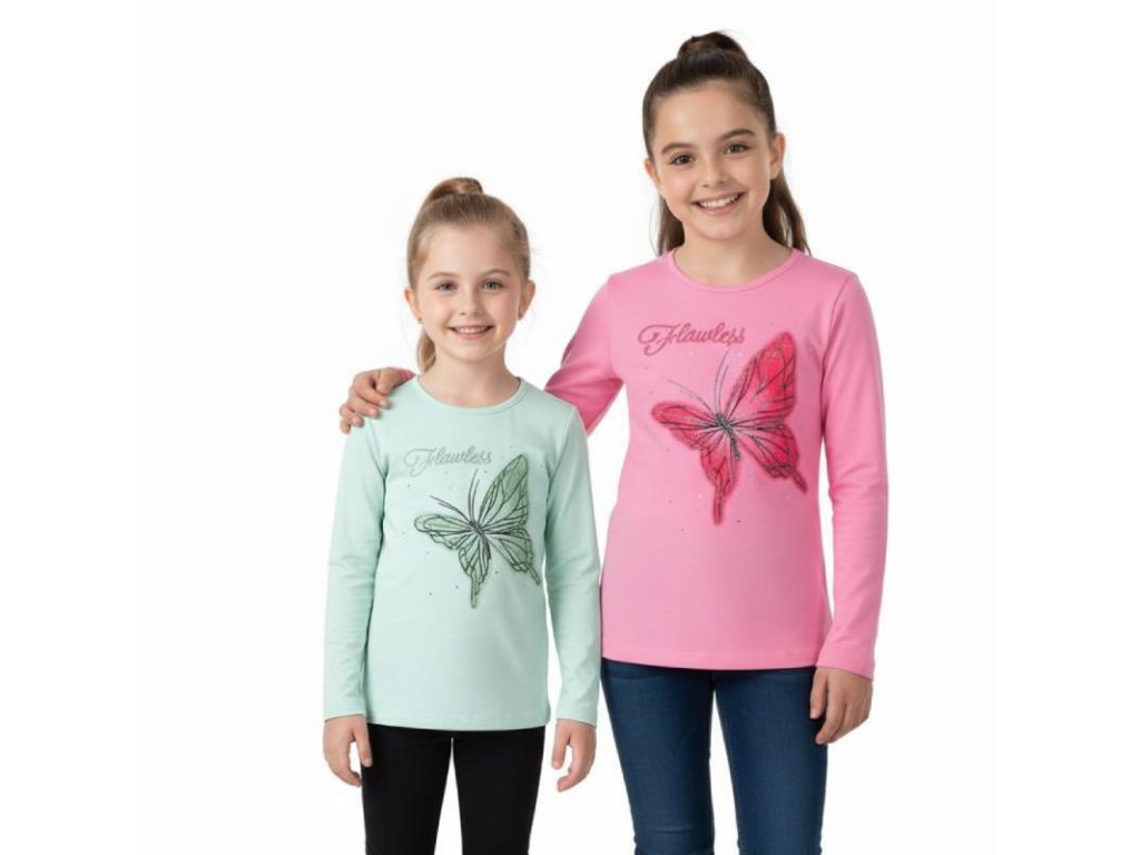 Dívčí, bavlněné tričko s dlouhým rukávem v krásném designu s motýlem. Motýl je doplněn třpytivými kamínky, čímž se stane tričko originálním kouskem dívčího šatníku. Materiál je velice příjemný na omak i na tělo a jeho složení je 95ˇbavlna a 5% elastan. Při tomto složení je tričko velice pružné a zachovává stálý tvar.