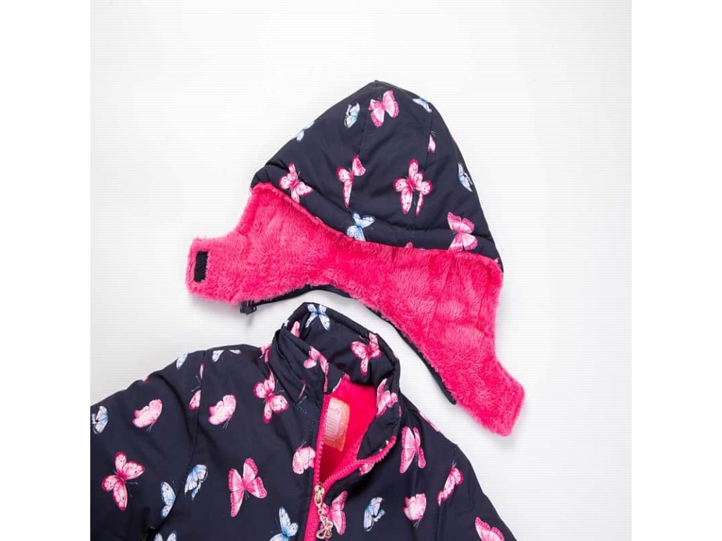Stylová dívčí zimní bunda s kapucí a veselým motivem barevných motýlků je ideální volbou pro všechny malé parádnice. Díky hřejivé růžové kožíškové podšívce je bunda velmi pohodlná a perfektně ochrání proti chladu i větru. Hodí se na běžné nošení do školky, na zimní procházky i na hraní venku.